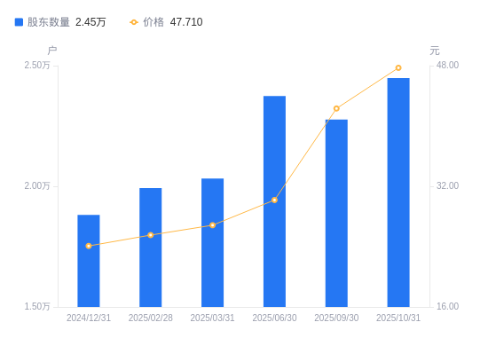12月11日消息,数据显示,截至2025年10月31日,华正新材A股股东总户数为2.45万户,较上期(2025年9月30日)增加1719户,增幅7.55%。公司最新A股总股本为1.42亿股,其中流通A股1.42亿股,户均持有流通A股数量为5800.18股,较上期减少437.94股,降幅7.02%;户均持流通A股市值27.67万元,较上期增加1.27万元,增幅4.82%。