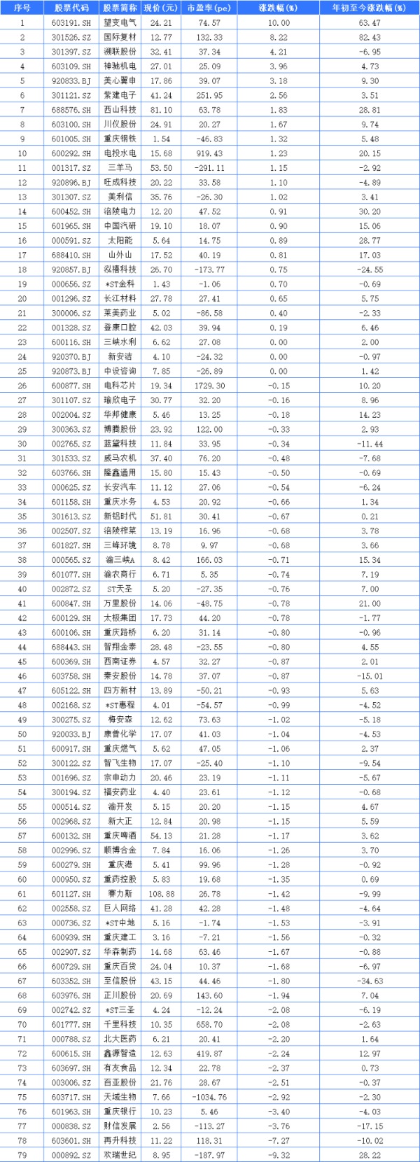 79家重庆A股上市公司中有22家上涨,3家平收,下跌54家。