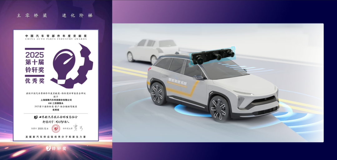 12月6日,2025第十届铃轩奖颁奖典礼在苏州举行,保隆科技(603197)的 “8M三目摄像头” 荣获 “第十届铃轩奖-量产类-组合辅助驾驶类优秀奖”。保隆科技高级副总裁文剑峰参会并代表公司领奖。此次获奖,体现了行业评委会对保隆科技摄像头最新技术的充分肯定,彰显了保隆科技在组合辅助驾驶领域优秀的技术实力。