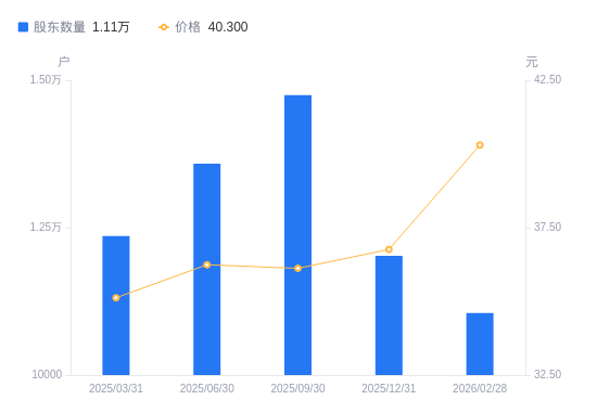 近一年(2025年2月28日至2026年2月28日),九华旅游A股股东户数从1.38万户,减低至1.11万户,降幅19.74%,区间股价上涨24.81%。