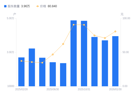 2月13日消息,数据显示,截至2026年1月30日,上海洗霸A股股东总户数为3.96万户,较上期(2025年12月31日)增加2473户,增幅6.67%。公司最新A股总股本为1.75亿股,其中流通A股1.75亿股,户均持有流通A股数量为4436.81股,较上期减少295.92股,降幅6.25%;户均持流通A股市值35.87万元,较上期增加2.2万元,增幅6.53%。