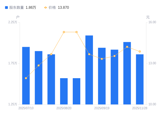 近一年(2024年12月31日至2025年11月28日),镇洋发展A股股东户数从1.99万户,减低至1.86万户,降幅6.68%,区间股价上涨61.37%。