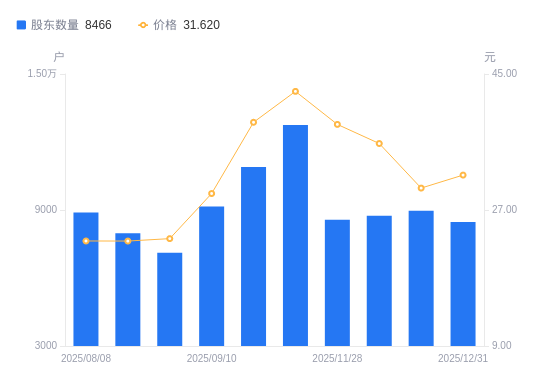 近一年(2024年12月31日至2025年12月31日),菲林格尔A股股东户数从7462户,增加至8466户,增幅13.45%,区间股价上涨545.31%。