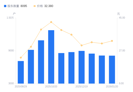 2月2日消息,数据显示,截至2026年1月20日,菲林格尔A股股东总户数为8095户,较上期(2026年1月9日)减少24户,降幅0.30%。公司最新A股总股本为3.55亿股,其中流通A股3.55亿股,户均持有流通A股数量为4.39万股,较上期增加129.81股,增幅0.30%;户均持流通A股市值142.2万元,较上期增加6.64万元,增幅4.90%。