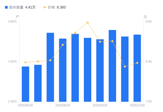 近一年(2024年12月20日至2025年12月20日),雪峰科技A股股东户数从3万户,增加至4.41万户,增幅47.20%,区间股价下跌5.32%。