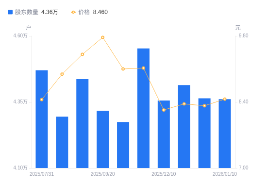 1月19日消息,数据显示,截至2026年1月10日,雪峰科技A股股东总户数为4.36万户,较上期(2025年12月31日)减少31户,降幅0.07%。公司最新A股总股本为10.72亿股,其中流通A股10.72亿股,户均持有流通A股数量为2.46万股,较上期增加17.46股,增幅0.07%;户均持流通A股市值20.79万元,较上期增加3585.92元,增幅1.75%。