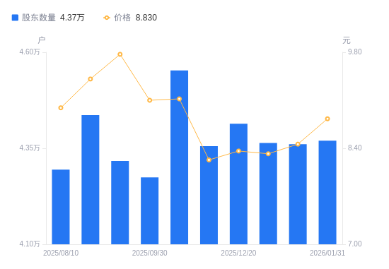 近一年(2025年2月10日至2026年1月31日),雪峰科技A股股东户数从2.99万户,增加至4.37万户,增幅45.99%,区间股价上涨4.50%。