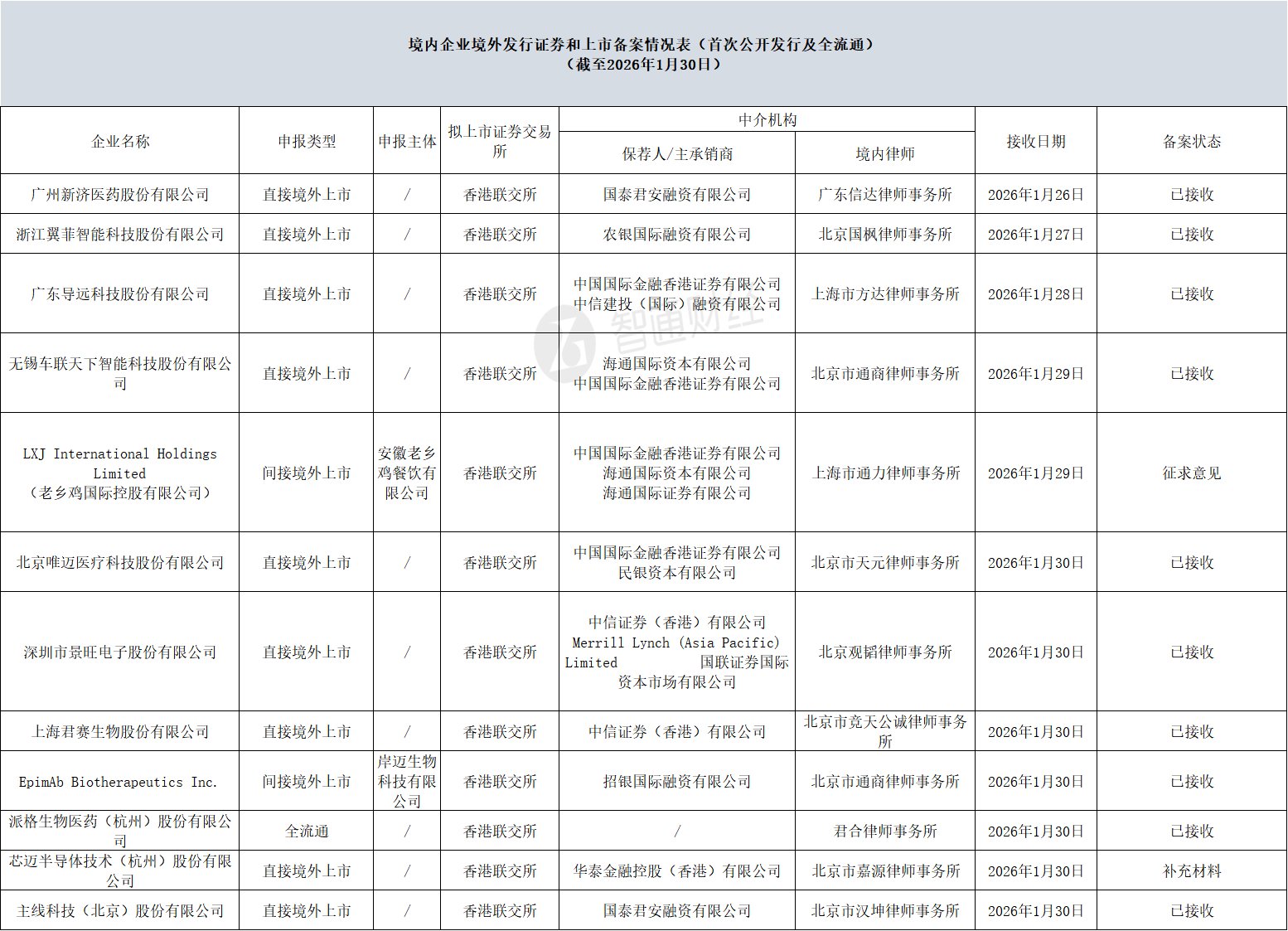 1月30日,中国证监会发布《境内企业境外发行证券和上市备案情况表(首次公开发行及全流通)(截至2026年1月30日)》,其中,新济医药、翼菲科技、导远科技、车联天下、唯迈医疗、景旺电子(603228)、君赛生物、主线科技拟香港IPO获中国证监会接收材料;老乡鸡(间接境外上市)拟香港IPO备案状态为征求意见;芯迈半导体拟香港IPO备案状态为补充材料。