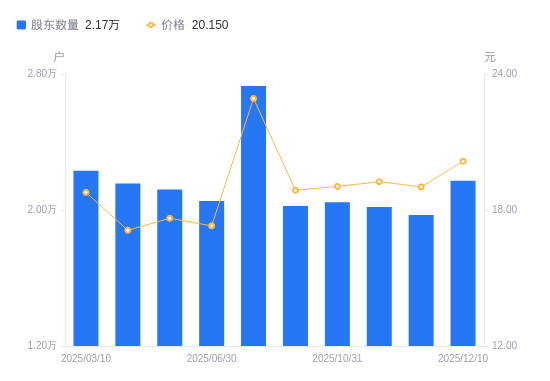 近一年(2024年12月31日至2025年12月10日),天元智能A股股东户数从2.32万户,减低至2.17万户,降幅6.30%,区间股价上涨16.91%。