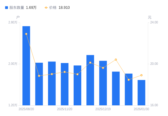 近一年(2025年2月28日至2026年1月30日),天元智能A股股东户数从2.17万户,减低至1.69万户,降幅22.06%,区间股价上涨2.19%。
