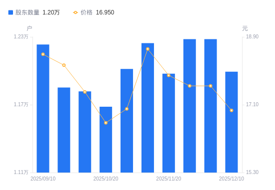 12月11日消息,数据显示,截至2025年12月10日,恒兴新材A股股东总户数为1.2万户,较上期(2025年11月30日)减少288户,降幅2.35%。公司最新A股总股本为2.08亿股,其中流通A股7564.23万股,户均持有流通A股数量为6307.73股,较上期增加147.93股,增幅2.40%;户均持流通A股市值10.69万元,较上期减少1496.39元,降幅1.38%。