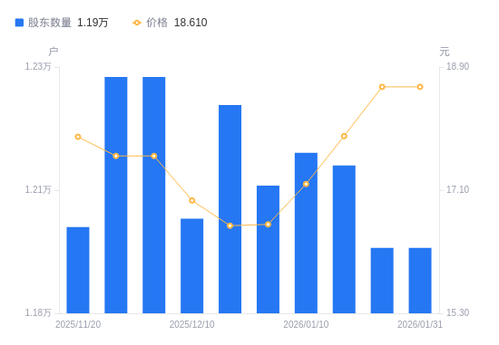 近一年(2025年3月31日至2026年1月30日),恒兴新材A股股东户数从1.34万户,减低至1.19万户,降幅10.94%,区间股价上涨14.20%。