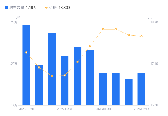近一年(2025年3月31日至2026年2月13日),恒兴新材A股股东户数从1.34万户,减低至1.19万户,降幅10.95%,区间股价上涨12.30%。