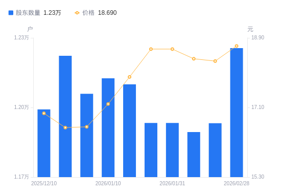 近一年(2025年3月31日至2026年2月28日),恒兴新材A股股东户数从1.34万户,减低至1.23万户,降幅8.53%,区间股价上涨14.69%。