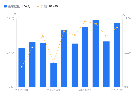 近一年(2024年11月20日至2025年11月10日),泰瑞机器A股股东户数从1.6万户,减低至1.59万户,降幅0.70%,区间股价上涨29.24%。