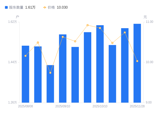 近一年(2024年11月29日至2025年11月28日),泰瑞机器A股股东户数从1.58万户,增加至1.61万户,增幅1.78%,区间股价上涨14.50%。