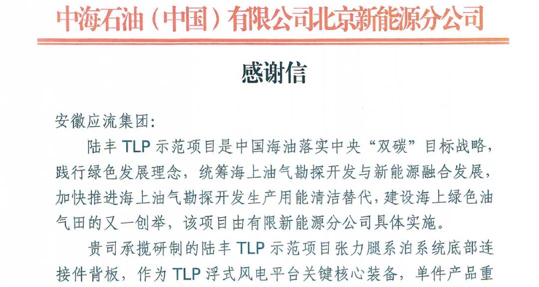 从“深海一号”到 “海葵一号”,继陵水项目、流花项目到陆丰项目,安徽应流与中海石油的合作不断求新向高,为我国海洋工程装备关键核心技术实现决定性突破,保障国家能源转型战略落地,培育发展海洋能源新质生产力贡献力量。