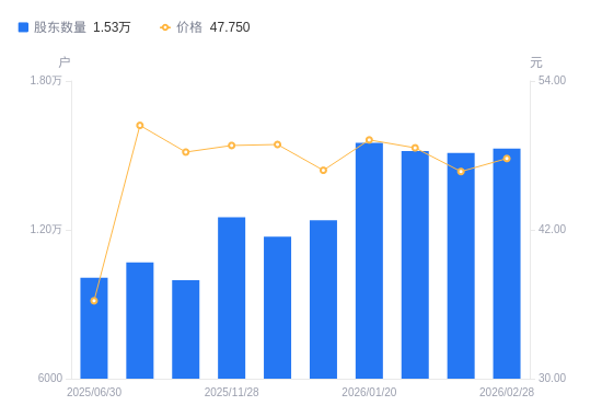 近一年(2025年2月28日至2026年2月28日),西典新能A股股东户数从1.06万户,增加至1.53万户,增幅43.64%,区间股价上涨34.89%。