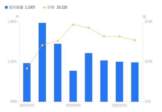 近一年(2024年12月31日至2025年12月20日),迪贝电气A股股东户数从1.18万户,增加至1.19万户,增幅0.98%,区间股价上涨27.32%。