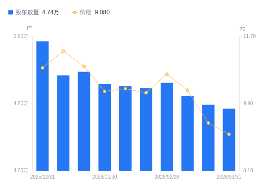 4月1日消息,数据显示,截至2026年3月31日,福蓉科技A股股东总户数为4.74万户,较上期(2026年3月20日)减少474户,降幅0.99%。公司最新A股总股本为10.45亿股,其中流通A股10.45亿股,户均持有流通A股数量为2.21万股,较上期增加218.46股,增幅1.00%;户均持流通A股市值20.03万元,较上期减少4568.94元,降幅2.23%。