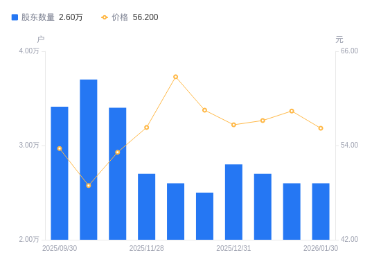 2月4日消息,数据显示,截至2026年1月30日,浙江鼎力A股股东总户数为2.6万户,较上期(2026年1月20日)不变。公司最新A股总股本为5.06亿股,其中流通A股5.06亿股,户均持有流通A股数量为1.95万股,较上期不变;户均持流通A股市值109.45万元,较上期减少4.27万元,降幅3.75%。