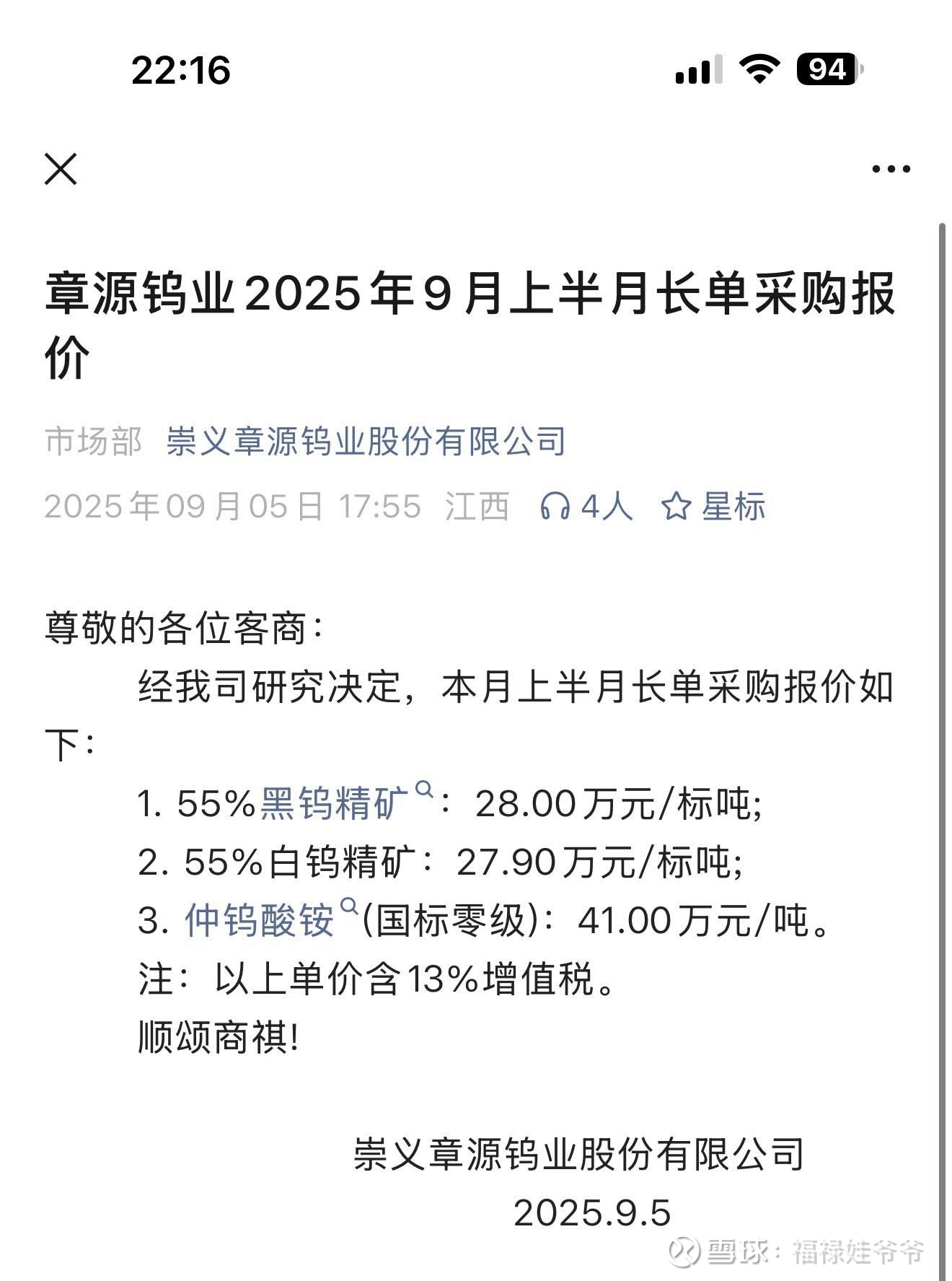 上半年钨精矿均价14万每吨,三季度目前均价是27万每吨,章源钨业这周五到下周二这个时间段会发长协涨价,所以以