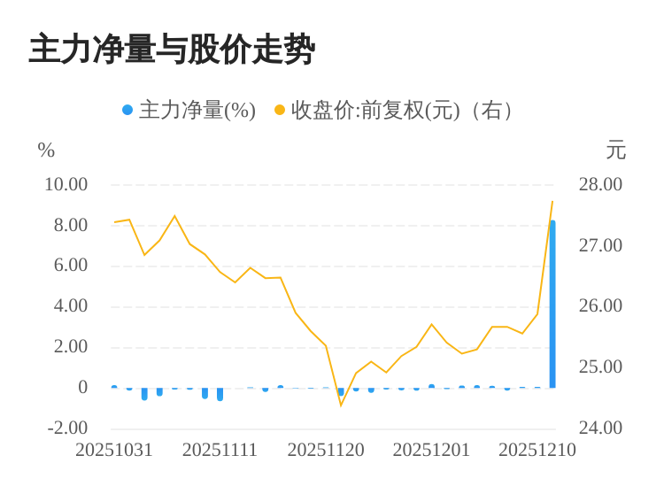 星德胜(603344)12月11日主力(dde大单净额)净流入1.27亿元,涨跌幅为7.19%,主力净量(dde大单净额/流通股)为8.28%,两市排名1/5171。
