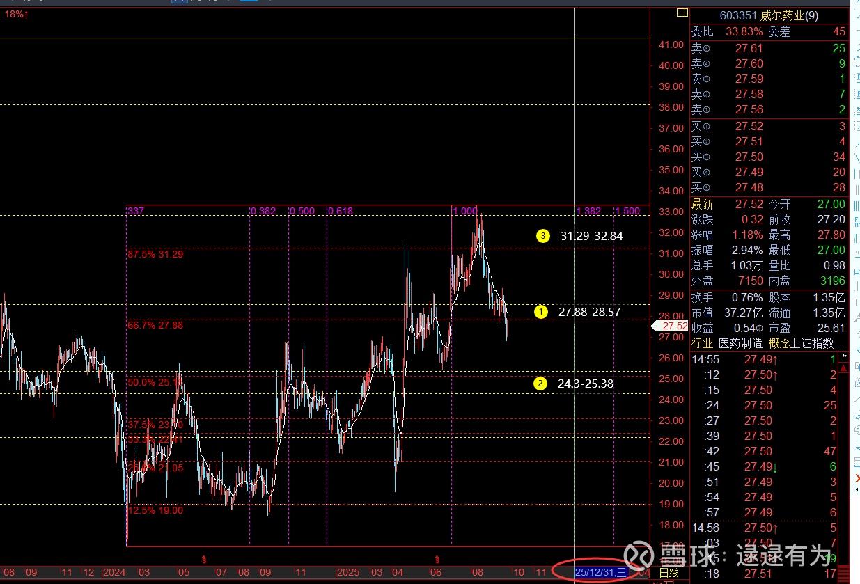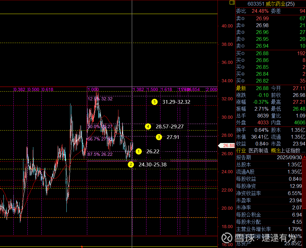 威尔这波趋势大概率还没结束,三分位附近32.84遇阻回落,空间支撑27.88-28.57,能稳住,趋势就没问题,那么突破压力31.29-32.84后会继续冲次高压力38.15附近。