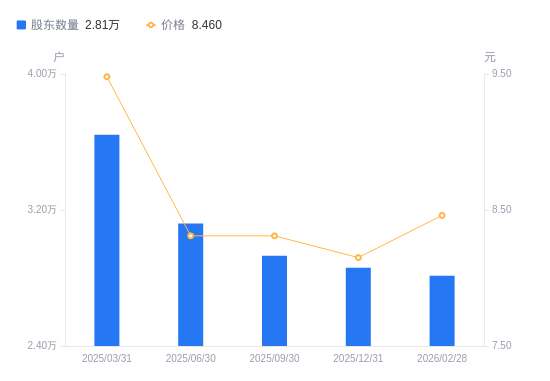 近一年(2024年12月31日至2025年12月31日),设计总院A股股东户数从3.41万户,减低至2.86万户,降幅16.01%,区间股价下跌8.22%。