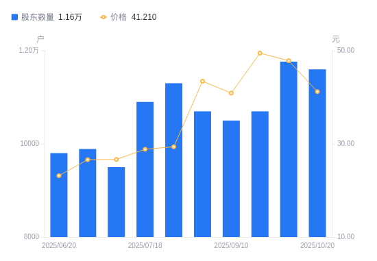12月8日消息,数据显示,截至2025年11月28日,易德龙A股股东总户数为1.2万户,较上期(2025年10月20日)增加400户,增幅3.45%。公司最新A股总股本为1.6亿股,其中流通A股1.6亿股,户均持有流通A股数量为1.34万股,较上期减少461.04股,降幅3.33%;户均持流通A股市值48万元,较上期减少9万元,降幅15.79%。