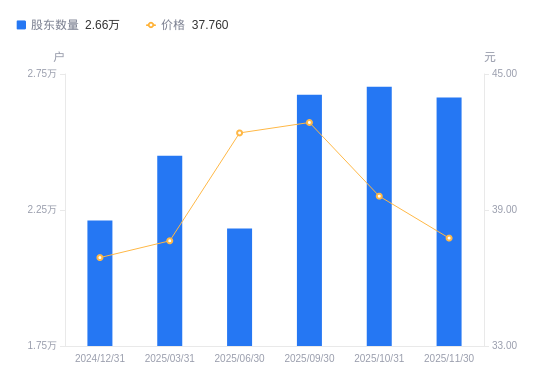 近一年(2024年12月31日至2025年11月30日),顶点软件A股股东户数从2.21万户,增加至2.66万户,增幅20.44%,区间股价下跌2.91%。