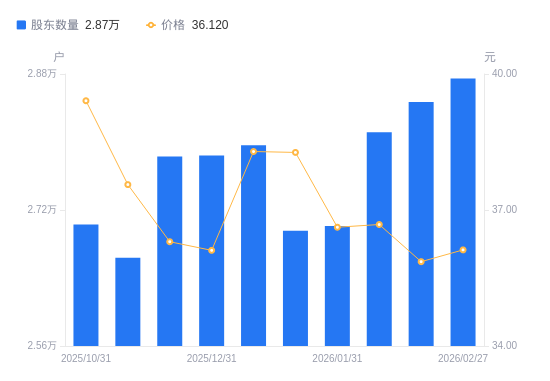 3月2日消息,数据显示,截至2026年2月27日,顶点软件A股股东总户数为2.87万户,较上期(2026年2月13日)增加276户,增幅0.97%。公司最新A股总股本为2.05亿股,其中流通A股2.05亿股,户均持有流通A股数量为7144.02股,较上期减少69.25股,降幅0.96%;户均持流通A股市值25.8万元,较上期减少625.94元,降幅0.24%。