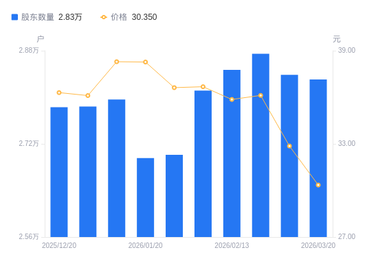 3月24日消息,数据显示,截至2026年3月20日,顶点软件A股股东总户数为2.83万户,较上期(2026年3月10日)减少79户,降幅0.28%。公司最新A股总股本为2.05亿股,其中流通A股2.05亿股,户均持有流通A股数量为7255.32股,较上期增加20.19股,增幅0.28%;户均持流通A股市值22.02万元,较上期减少1.75万元,降幅7.38%。