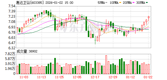 二级市场上,截至1月22日收盘,惠达卫浴上涨1.26%报7.23元/股,总市值约27.52亿元,近一年来公司股价累计上涨约16%。