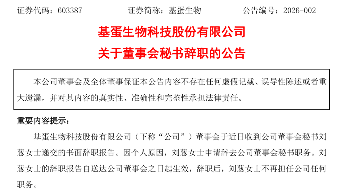 基蛋生物3月20日公告:基蛋生物董事会于近日收到公司董事会秘书刘葱女士递交的书面辞职报告。