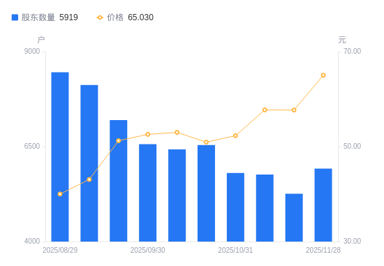 近一年(2024年11月29日至2025年11月28日),力聚热能A股股东户数从1.55万户,减低至5919户,降幅61.71%,区间股价上涨61.08%。