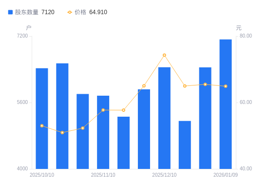 1月13日消息,数据显示,截至2026年1月9日,力聚热能A股股东总户数为7120户,较上期(2025年12月31日)增加674户,增幅10.46%。公司最新A股总股本为9100万股,其中流通A股2275万股,户均持有流通A股数量为3195.22股,较上期减少334.1股,降幅9.47%;户均持流通A股市值20.74万元,较上期减少2.37万元,降幅10.24%。