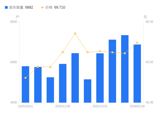 2月4日消息,数据显示,截至2026年1月30日,力聚热能A股股东总户数为6882户,较上期(2026年1月20日)减少462户,降幅6.29%。公司最新A股总股本为9100万股,其中流通A股2275万股,户均持有流通A股数量为3305.73股,较上期增加207.96股,增幅6.71%;户均持流通A股市值23.04万元,较上期增加3.08万元,增幅15.44%。