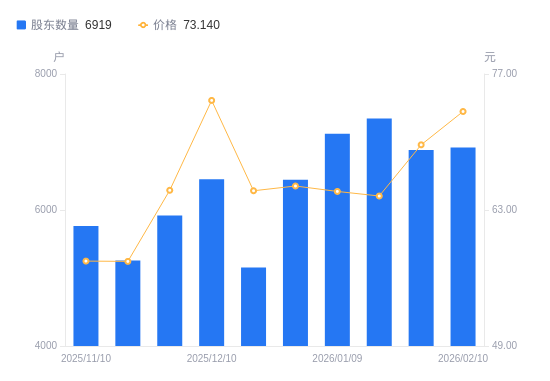 2月13日消息,数据显示,截至2026年2月10日,力聚热能A股股东总户数为6919户,较上期(2026年1月30日)增加37户,增幅0.54%。公司最新A股总股本为9100万股,其中流通A股2275万股,户均持有流通A股数量为3288.05股,较上期减少17.68股,降幅0.53%;户均持流通A股市值24.05万元,较上期增加1万元,增幅4.36%。