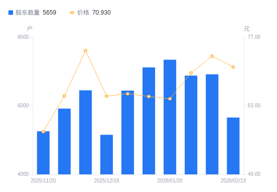 2月26日消息,数据显示,截至2026年2月13日,力聚热能A股股东总户数为5659户,较上期(2026年2月10日)减少1260户,降幅18.21%。公司最新A股总股本为9100万股,其中流通A股2275万股,户均持有流通A股数量为4020.14股,较上期增加732.1股,增幅22.27%;户均持流通A股市值28.51万元,较上期增加4.47万元,增幅18.57%。