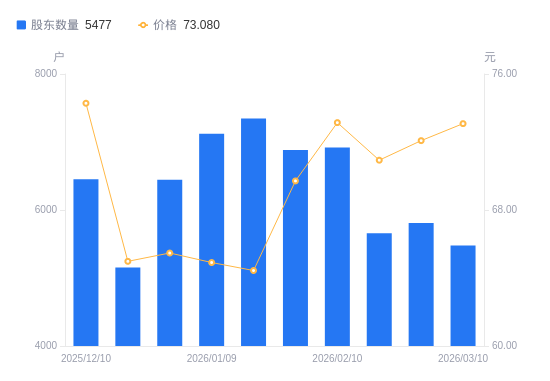 3月13日消息,数据显示,截至2026年3月10日,力聚热能A股股东总户数为5477户,较上期(2026年2月27日)减少332户,降幅5.72%。公司最新A股总股本为9100万股,其中流通A股2275万股,户均持有流通A股数量为4153.73股,较上期增加237.4股,增幅6.06%;户均持流通A股市值30.36万元,较上期增加2.13万元,增幅7.53%。