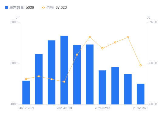 3月25日消息,数据显示,截至2026年3月20日,力聚热能A股股东总户数为5006户,较上期(2026年3月10日)减少471户,降幅8.60%。公司最新A股总股本为9100万股,其中流通A股2275万股,户均持有流通A股数量为4544.55股,较上期增加390.81股,增幅9.41%;户均持流通A股市值30.73万元,较上期增加3747.37元,增幅1.23%。