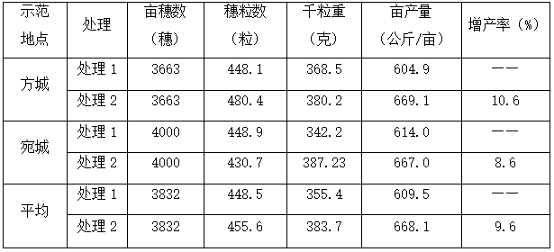 每个示范点均设2个处理,处理1:常规施肥处理,施用普通复合肥料,方城示范点亩施40.0%(28-6-6)50kg,宛城示范点亩施40.0%(29-5-6)60kg。处理2:示范处理,方城示范点和宛城示范点均亩施养吧控失肥40.0%(29-5-6)50kg,除底肥处理不同外,其他耕作及田间管理措施完全一致。