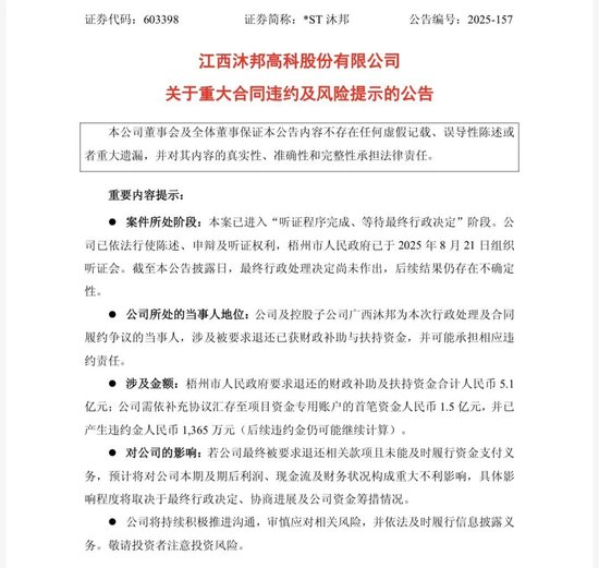1月26日,梧州市政府发出一纸决定书,勒令*ST沐邦退回5.1亿元财政支持款。