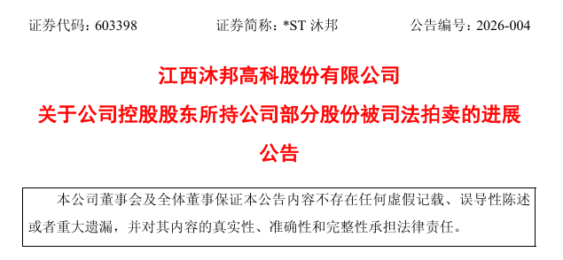 公告显示,江西沐邦高科股份有限公司(以下简称“公司”)近日获悉,上海市浦东新区人民法院(以下简称“上海浦东法院”)于2025年11月26日向控股股东江西沐邦新能源控股有限公司(以下简称“沐邦新能源控股”)出具《执行裁定书》((2025)沪0115执29691号),上海浦东法院将拍卖、变卖被执行人沐邦新能源控股持有公司部分股份2,363,264股无限售流通股股票。