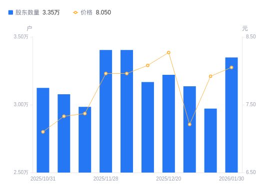 近一年(2025年2月10日至2026年1月30日),鼎信通讯A股股东户数从3.02万户,增加至3.35万户,增幅11.00%,区间股价上涨14.67%。