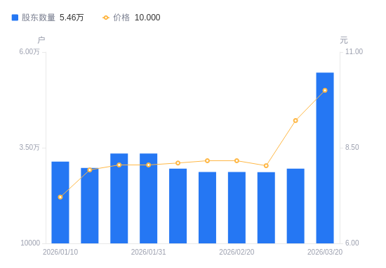 近一年(2025年3月20日至2026年3月20日),鼎信通讯A股股东户数从3.41万户,增加至5.46万户,增幅59.91%,区间股价上涨31.23%。