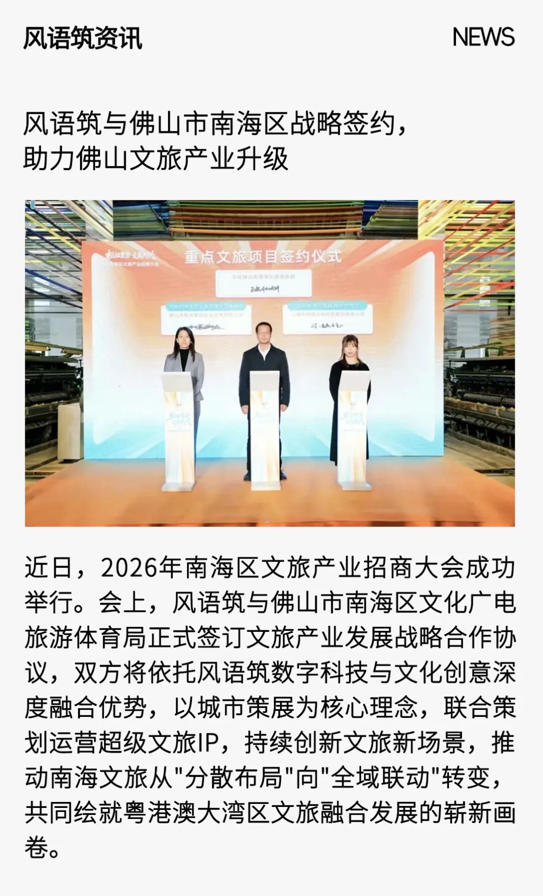 近日,上海风语筑(603466)文化科技股份有限公司与佛山市南海区文化广电旅游体育局正式签署战略合作协议,双方将依托风语筑数字科技与文化创意深度融合的核心优势,以城市策展为核心理念,携手推动南海文旅产业高质量发展,助力佛山文旅产业实现能级跃升,共同绘就粤港澳大湾区文旅融合发展的崭新画卷。