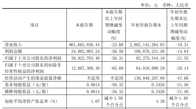 但进入2025年三季度,公司业绩出现明显下滑。前三季度财务数据显示,公司实现营业总收入29.02亿元,同比下降10.31%;归母净利润8227.55万元,同比下降21.55%。