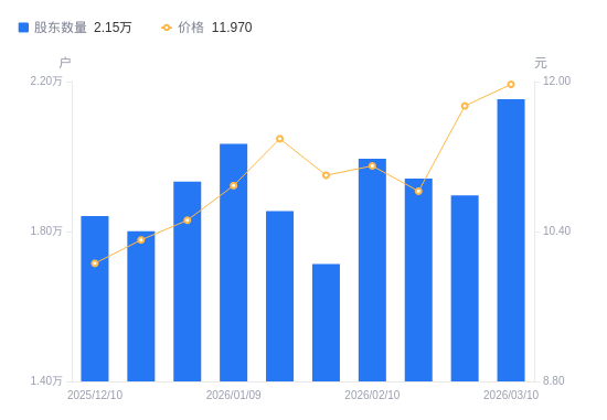 3月13日消息,数据显示,截至2026年3月10日,汇金通A股股东总户数为2.15万户,较上期(2026年2月27日)增加2566户,增幅13.53%。公司最新A股总股本为3.39亿股,其中流通A股3.39亿股,户均持有流通A股数量为1.58万股,较上期减少2131.8股,降幅11.92%;户均持流通A股市值18.86万元,较上期减少2.14万元,降幅10.19%。